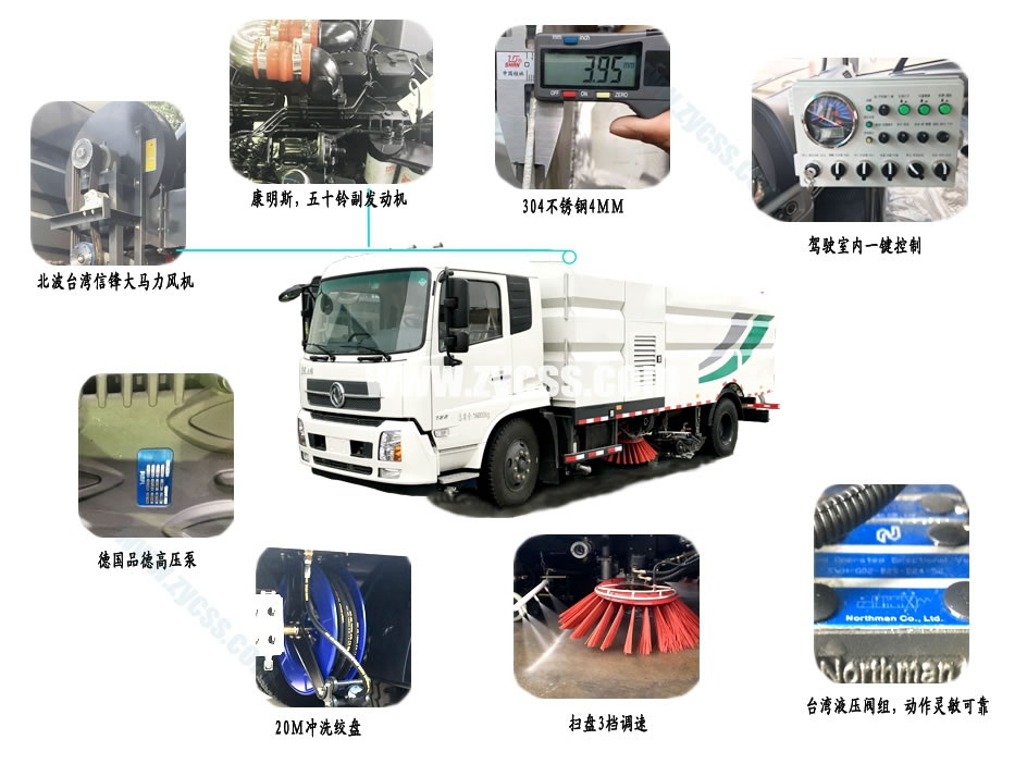 1、帶2個(gè)中置掃盤;中置超寬吸嘴;雙層吸塵筒;康明斯170馬力副發(fā)動(dòng)機(jī);臺灣液壓閥;大力馬達(dá);德國高壓水泵(前沖/側(cè)噴/中噴/后噴霧)/側(cè)沖洗水槍/垃圾箱自潔裝置);萬向高壓路沿清洗;威龍低壓泵(前沖),氣動(dòng)球閥控制;4mm不銹鋼垃圾箱;不銹鋼水箱;德國控制器;尾部箭頭燈;機(jī)油、垃圾箱、水箱均帶防溢或低位報(bào)警裝置;倒車及洗掃狀態(tài)室內(nèi)監(jiān)視器;多種語音提示;倒車自動(dòng)保護(hù)、防傾倒垃圾翻車保護(hù)、檢修安全保護(hù);20m高壓沖洗卷盤;刷臂轉(zhuǎn)動(dòng)機(jī)構(gòu)使用德國進(jìn)口高新耐磨工程隔套,免打黃油;精密冷彎無縫液壓油管;運(yùn)動(dòng)控制器一鍵電腦控制。