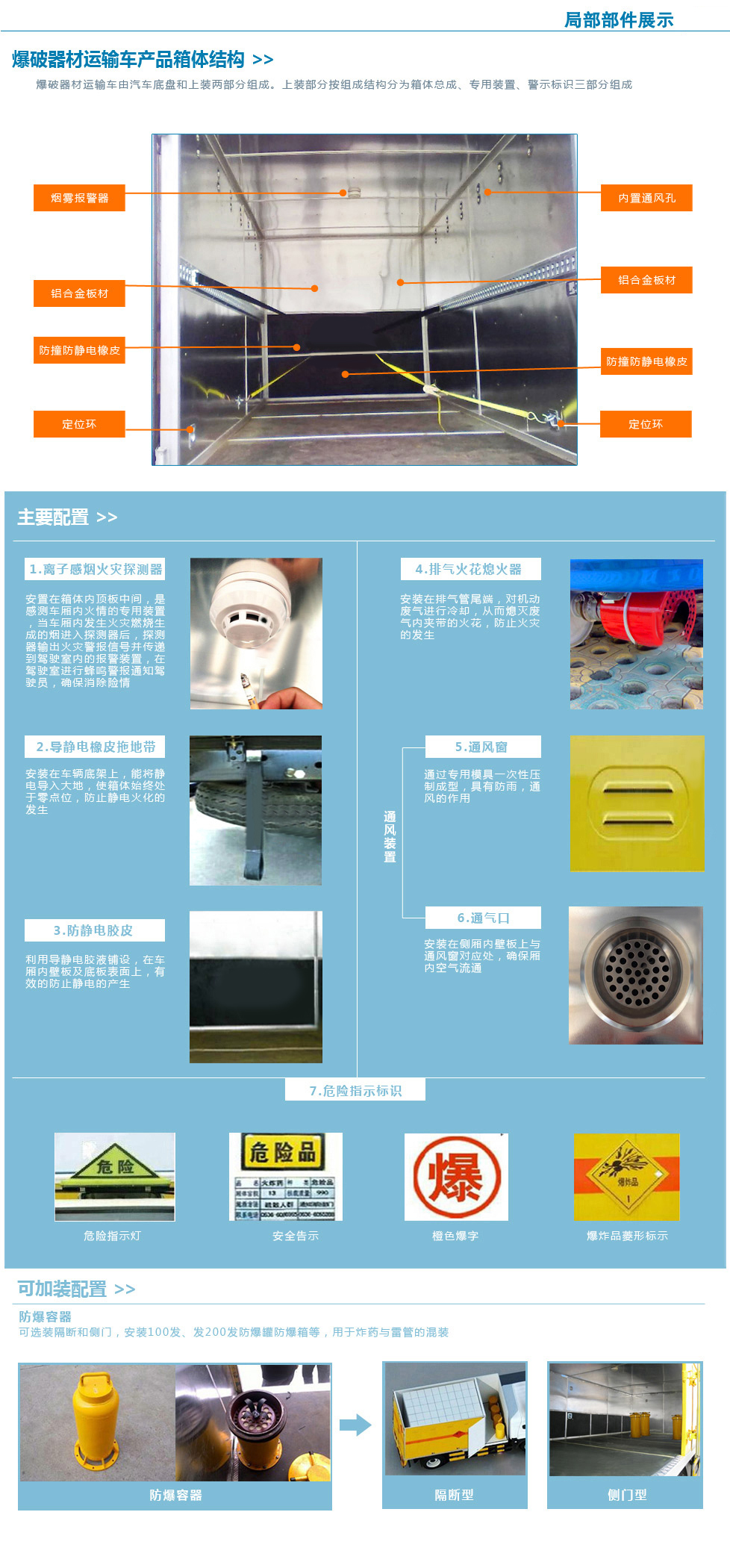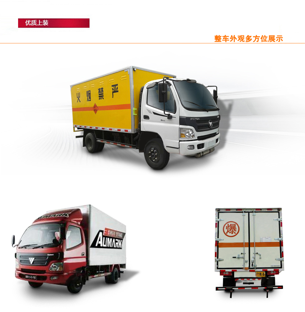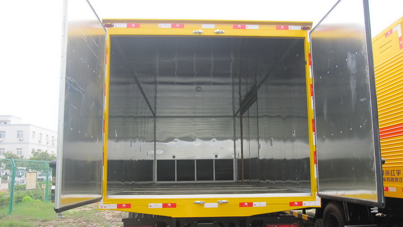 廂體頂部封閉,不可開(kāi)啟, 該車(chē)隨底盤(pán)選裝駕駛室,選裝右側(cè)面單門(mén)安裝位置靠近廂體前部;防護(hù)材料:Q235A碳鋼,連接方式:左右側(cè)面防護(hù)均采用焊接連接,后下部防護(hù)與車(chē)架采用焊接連接,后部防護(hù)斷面尺寸(mm):120?0,后部防護(hù)離地高度(mm):450。運(yùn)輸品名:炸藥,雷管,煙花爆竹等,類(lèi)項(xiàng)號(hào):1.1B,1.1D,1.1G,1.2G,1.3G,1.4G 等。選用ISD180 50,YC6JA180-50型號(hào)發(fā)動(dòng)機(jī),對(duì)應(yīng)油耗值(L/100km)分別為:26.8,27.1,整車(chē)長(zhǎng)度與軸距對(duì)應(yīng)關(guān)系(mm):8990/5100,8590/4700。該車(chē)安裝具有衛(wèi)星定位功能的行駛記錄儀,僅采用底盤(pán)子午線(xiàn)輪胎和帶ABS的底盤(pán); 該車(chē)前置排氣管,安裝限速裝置,限速80km/h, ABS型號(hào)為ABS-E 4S/4M,生產(chǎn)企業(yè)是威伯科汽車(chē)控制系統(tǒng)(中國(guó))有限公司。