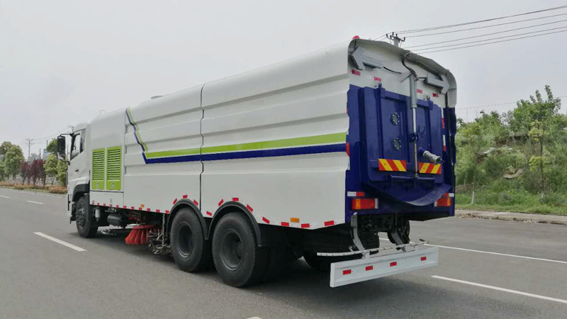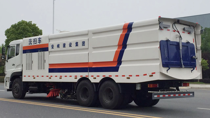 6)具備倒車保護(hù)裝置,在作業(yè)過程中如遇緊急倒車,智能化的控制系統(tǒng)會(huì)自動(dòng)停止作業(yè)并收回掃盤、吸盤和側(cè)噴桿;具有防止舉升垃圾箱翻車保護(hù);具有檢修安全保護(hù)。